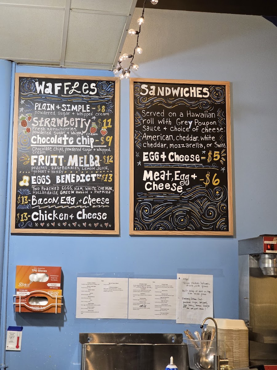 Belgian waffle topped with sliced Strawberries, Powdered sugar and Whipped cream. Served with a side of syrup.